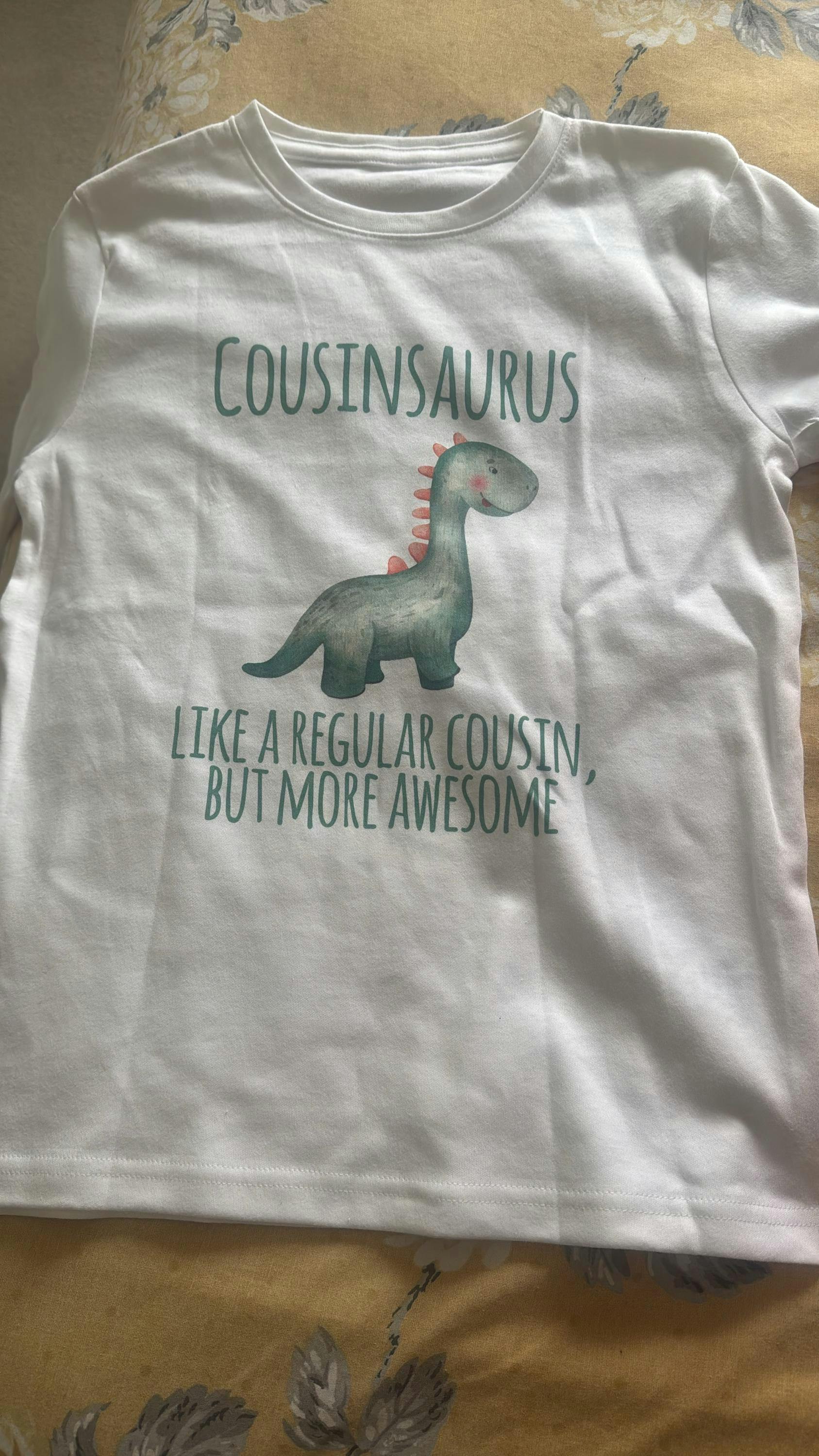 Get ready for some dino-mite news with our Cousinsaurus T-shirt! Perfect for announcing your little one's arrival to your favorite big cousin who loves playing with dinosaurs. Available in t-shirts and baby bodysuits. And if you can't find the size you need, just let us know.